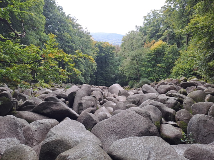Wir treffen uns am Darmstädter Hauptbahnhof und fahren mit der RB67 nach Bensheim und per Bus weiter bis nach Reichenbach. Hier starten wir in Richtung Felsenmeer, wo wir heute nicht den ganzen Tag kletternd auf den Granitbrocken verbringen, sondern uns auf den Aufstieg entlang des Felsenmeers mit ein wenig Kraxelei beschränken. Imposante Formationen wie Delphin, Riesensäule oder Altarstein lassen wir aber natürlich nicht links liegen. Oben angekommen erreichen wir bald den unspektakulären Gipfel des Felsbergs, mit 514m den höchsten Punkt der Wanderung. Nun können wir bei gutem Wetter bereits das erste mal die Frankfurter Skyline sehen und es geht hinab zur Kuralpe.